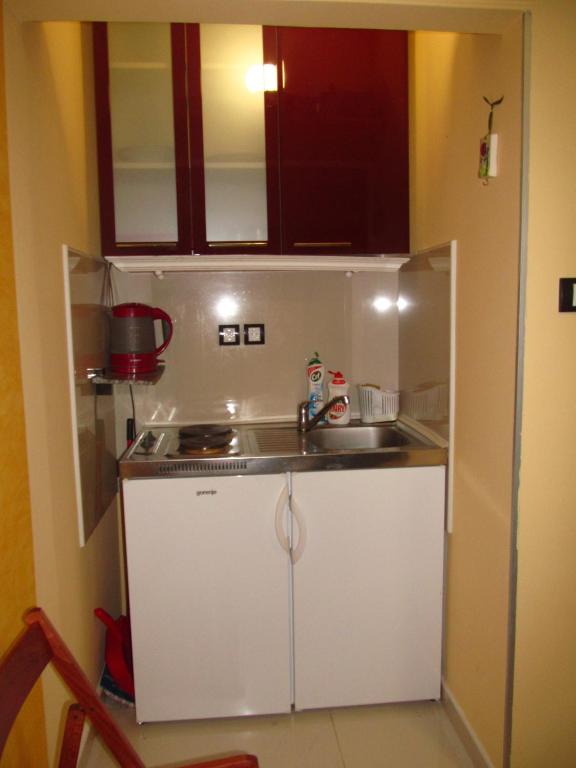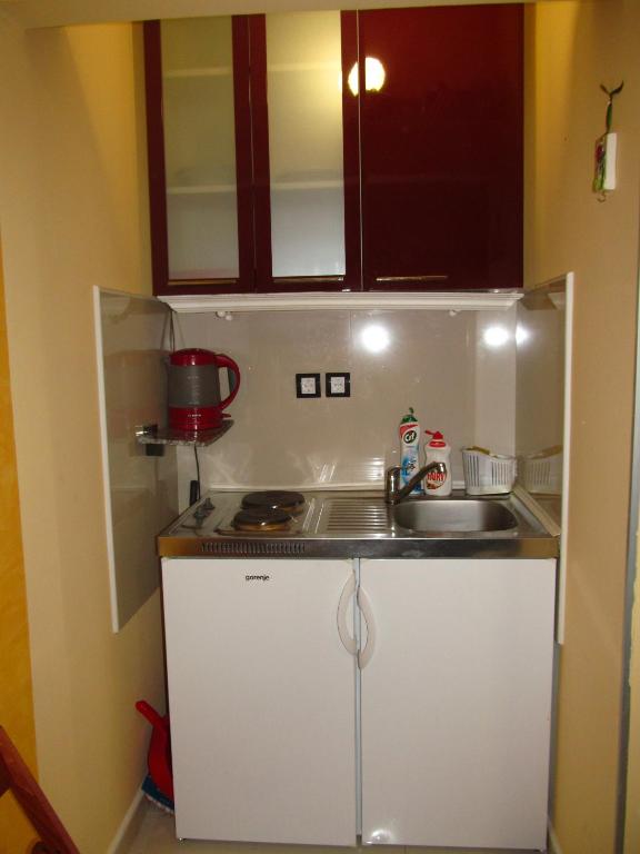 čajna kuhinja, frižider, električno kuvalo, posuđe, sredstva za čišćenje, sto za ručavanje, čaše za vino