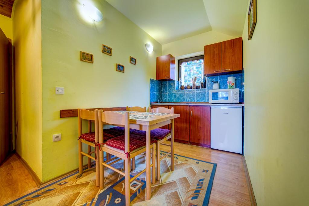 čajna kuhinja, frižider, mikrotalasna rerna, kuhinja, električno kuvalo, posuđe, ploča za kuvanje, sredstva za čišćenje, sto za ručavanje, čaše za vino